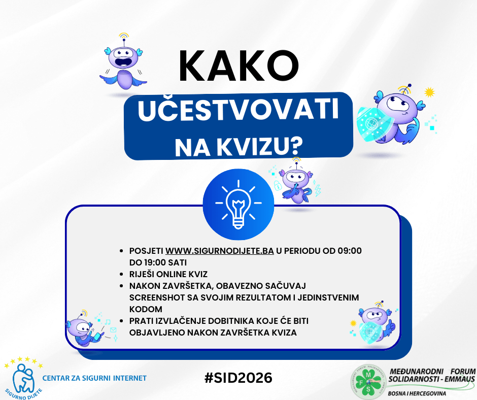 Dan sigurnijeg interneta 2026 u Bosni i Hercegovini obilježavamo kroz veliki online edukativni kviz namijenjen djeci i mladima širom zemlje. Kviz će biti dostupan u utorak, 10. februara / veljače 2026. godine, u periodu od 09:00 do 19:00 sati, na web platformi Centra za sigurni internet www.sigurnodijete.ba